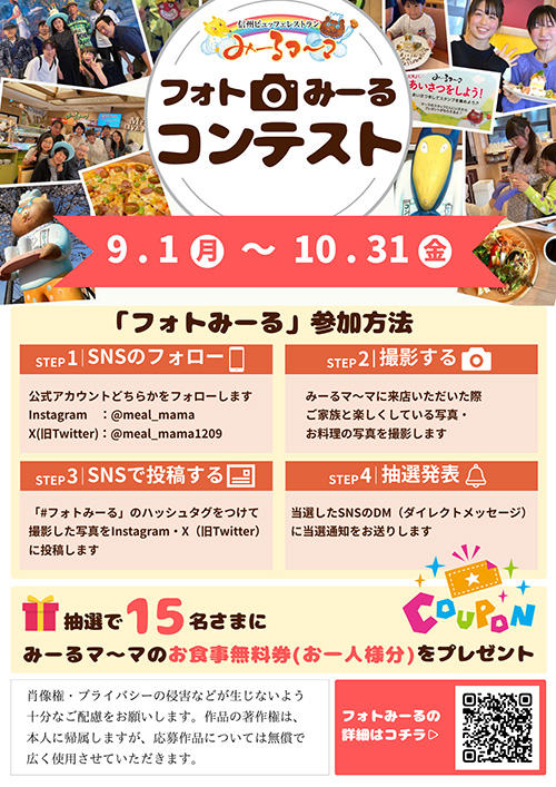 いつもみーるマ~マをご愛顧いただきありがとうございます。ただいまみーるマ~マでは第1回フォトみーるコンテストを開催しております。フォトみーるとはご家族やご友人でみーるマ~マでの楽しいシーンをSNSでみんなでシェアする参加型のフォトコンテストです。投稿してくださった方の中から抽選で15名の方にみーるマ~マでご利用いただけるお食事券をプレゼントさせていただきます。