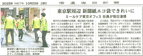 「この度、弊社の社会貢献活動の一つである、東京駅周辺での清掃活動の取り組みが、10月25日(土)発行の信濃毎日新聞に掲載されました。 弊社東京オフィス(東京都中央区八重洲)の社員が、毎朝、東京駅八重洲口周辺で実施している清掃活動について取り上げていただいております。 特に、今年度から長野市の障がい者就労支援事業所「ずくや」(弊社グループ会社)で作られた新聞紙製のエコ袋を清掃活動に使用している点や、長野と東京が連携した「美化活動を通じた人づくり」への想いなどが紹介されています。 ミールケアでは、今後も地域に根差した企業活動を続けるとともに、清掃活動を通じて障がい福祉支援にも貢献してまいります。