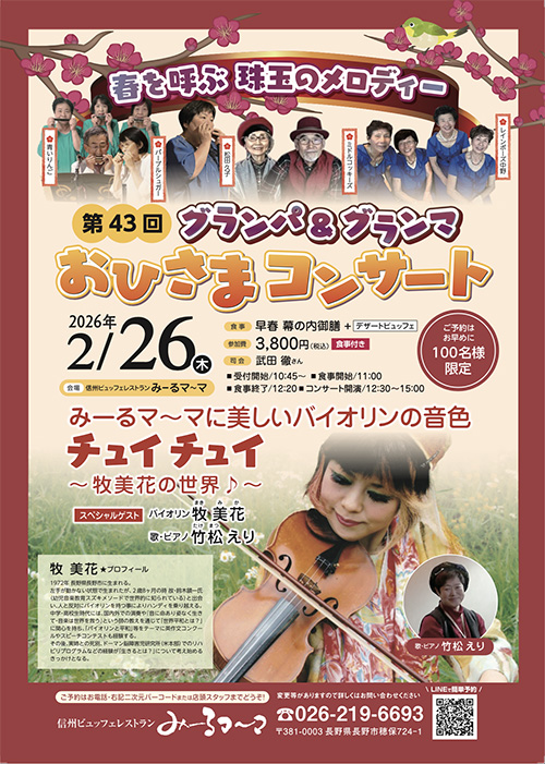 ■ 開催概要 ◉日時:2026年2月26日(木) 受付開始:10:45〜 食事開始:11:00〜(早春 幕の内御膳 + デザートビュッフェ) コンサート:12:30〜15:00 ◉会場:信州ビュッフェレストラン みーるマ〜マ(長野市穂保724-1) ◉参加費:3,800円(税込・食事付き) ◉定員:100名様限定(要予約) ◉司会:武田 徹さん ◉スペシャルゲスト: 牧 美花(バイオリン) 〜チュイチュイ 牧美花の世界♪〜 竹松 えり(歌・ピアノ) ◉ご予約:お電話: 026-219-6693・店頭スタッフまでどうぞ